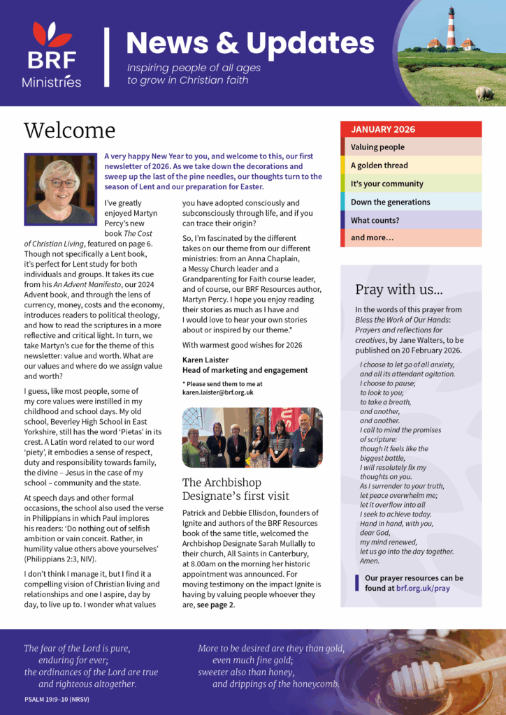 The first issue of BRF Ministries News in 2026 focuses on the theme of ‘value and worth’ and opens with a welcome from head of marketing and engagement Karen Laister. Karen writes:
