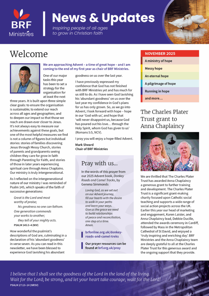 ‘I have previously expressed my confidence that God has not finished with BRF Ministries yet and has much for us still to do. As I have seen God lavishing his “abundant goodness” on us over the last year my confidence in God’s plans for us has only grown. So, as we go into Advent, I look forward with hope – hope in our “God with us”, and hope that ‘‘does not disappoint us, because God’s love has been poured out into our hearts through the Holy Spirit, who has been given to us.”’
