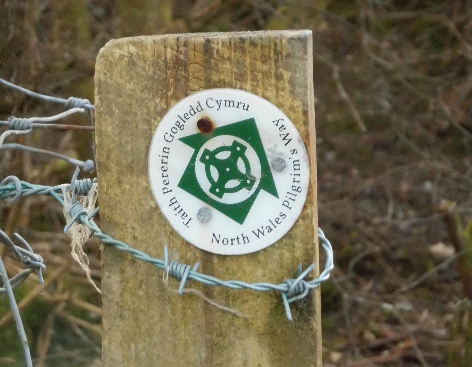 Photo: Taith Pererin Gogledd Cymru / North Wales Pilgrim’s Way waymark disc, Llanllechid by Meirion, CC BY-SA 2.0, via Wikimedia Commons; cropped.